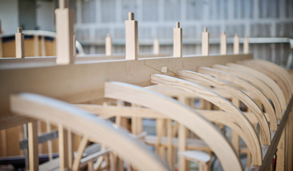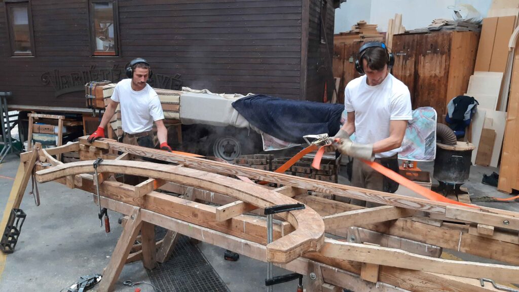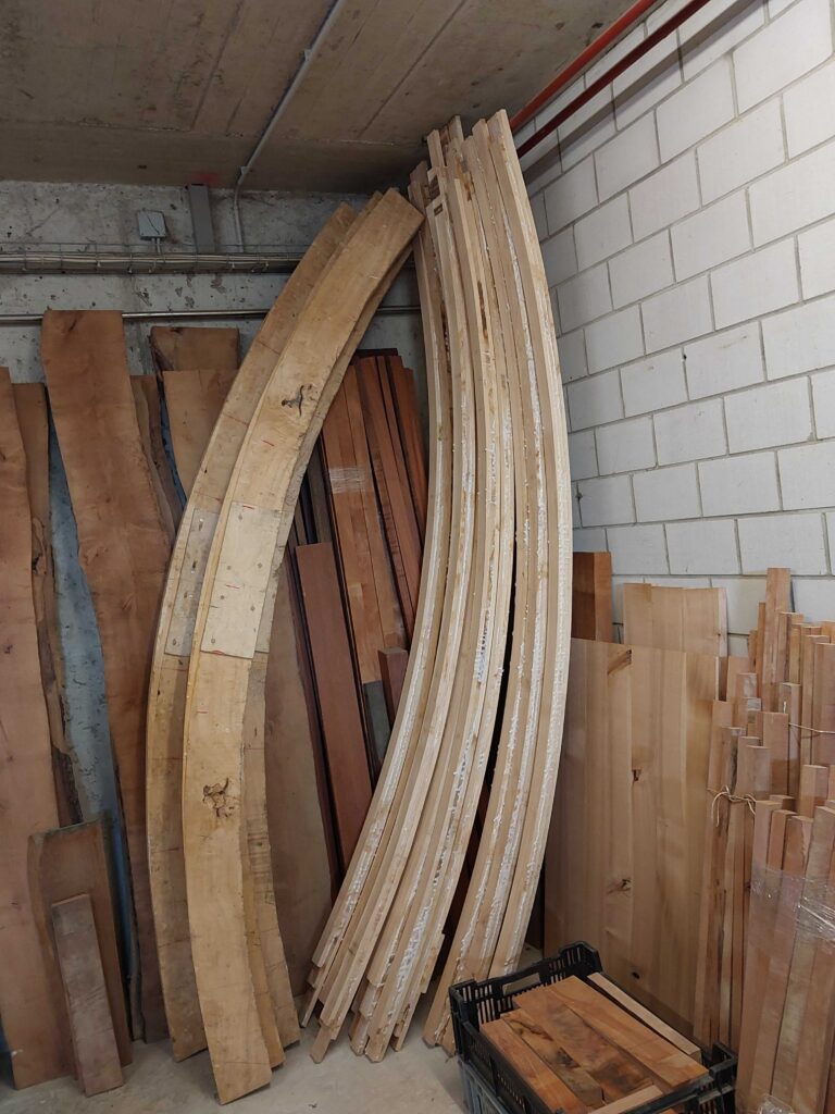 Die Bögen für die Wagendächer sind wie die Grundkonstruktion aus Esche. Diese werden aus drei durchgehenden Latten zu einem Bogen zusammengefügt. So ist es möglich Bögen mit einem kleinen Querschnitt zu fertigen, die sehr Stabil sind. Die Holzqualität für die Herstellung der Bögen ist von grosser Bedeutung. Aus diesem Grund wählen wir das Rundholz in der gewünschten Qualität vor dem Sägen und lassen es nach unseren Anforderungen einschneiden.