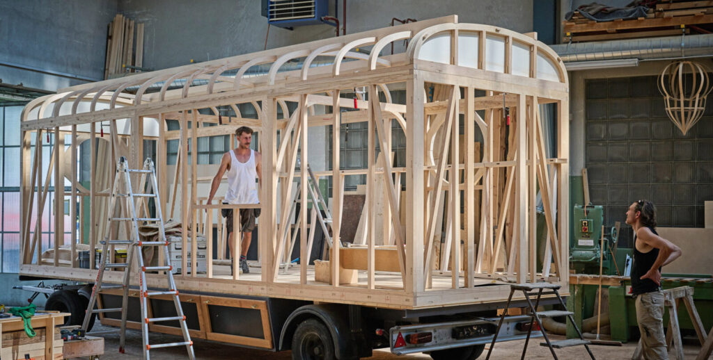 Bodenbeläge können nach Belieben gewählt werden. Ein Unterboden gehört zur Standardkonstruktion, denn dieser Schützt den Wagen von unten. Wenn Parkett gewünscht ist, gibt es einen Blindboden, der als Befestigungsgrundlage dient. Bei der meist-verbauten Variante – Riemenboden- braucht es keinen Blindboden. Die Riemen werden direkt an der Grundkonstruktion befestigt. Hier gibt es diverse Ausführungen in verschiedenen Hölzern.