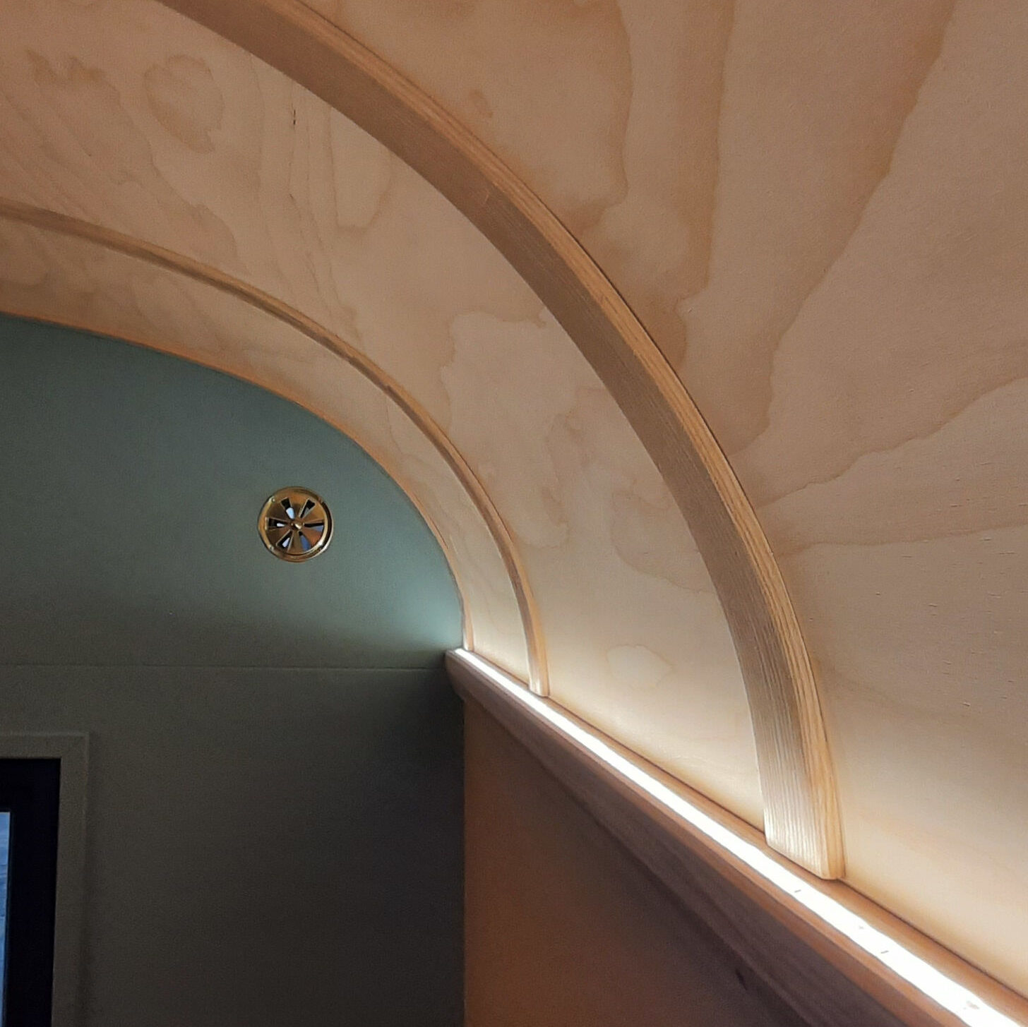 Alternativ zu den genuteten Bögen kann die Decke auch ganz mit Sperrholz ausgekleidet werden. Wahlweise kann dies mit Decklatten als Zierelemente ergänzt werden um optisch die Bogenkonstruktion nachzuahmen.